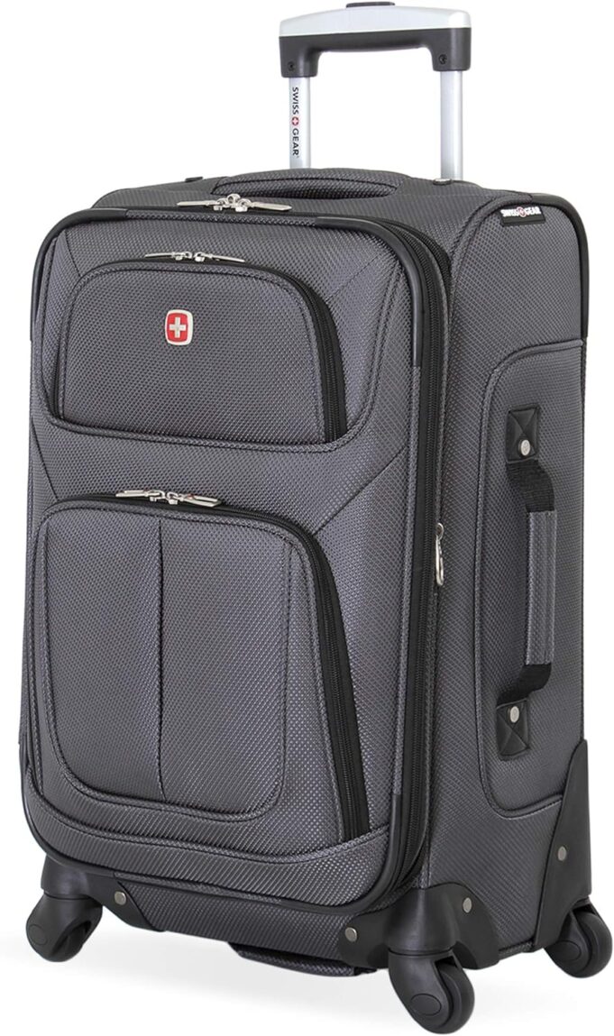 SwissGear Sion Softside Expandable Carry-On Spinner Luggage gives you an ample amount of packing space when needed. This rolling suitcase features a locking push/pull handle system and four 360-degree multi-directional spinner wheels for convenient portability. It is made from a durable, scuff-resistant polyester fabric and its interior is fully lined. This carry-on suitcase features adjustable luggage tie-down straps for securing garments in place, a removable zippered wet bag, a large mesh lid pocket, and a packing pocket for holding small items and accessories. It also includes two front panel pockets, a built-in ID tag, and padded top and side handles. At SwissGear, we continue to ensure whatever you need travels easily, safely, and stylishly with you. Great for a family trip or business travel.