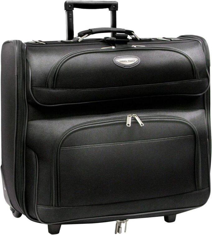 The Travel Select Amsterdam business rolling garment bag is ideal for keeping your clothes crisp and clean while you are traveling. This garment bag is made of industrial quality hardware; 1200d two-tone polyester construction with an EVA reinforced front panel. It features an internal handle system, inline skate wheels, and an adjustable and detachable shoulder strap with a non-slip pad. It has a spacious main compartment with zippered mesh pockets and multiple outside gusseted pockets for easy packing. The convenient tie straps secure items while the fold-out design helps to reduce wrinkles in suits. Plus, the top carry handle is designed for easy lifting and center strap is built in for carrying extra bag. Product Dimensions: 8”x23”x22”.
