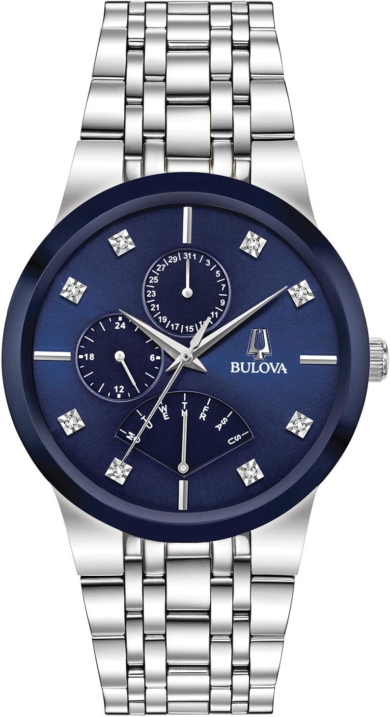 A bright new addition to the men’s Bulova Modern collection, offering uncompromising style. The edge-to-edge metalized mineral crystal provides the look of a brilliant blue bezel, enhancing the silver stainless steel case. The spectacular sunburst blue dial is set with 8 diamond hour markers. A sophisticated calendar display shows the date, weekday, and 24-hour time on three sub-dials. A perfectly matched stainless steel bracelet features a deployant buckle with pushers for easy closure.